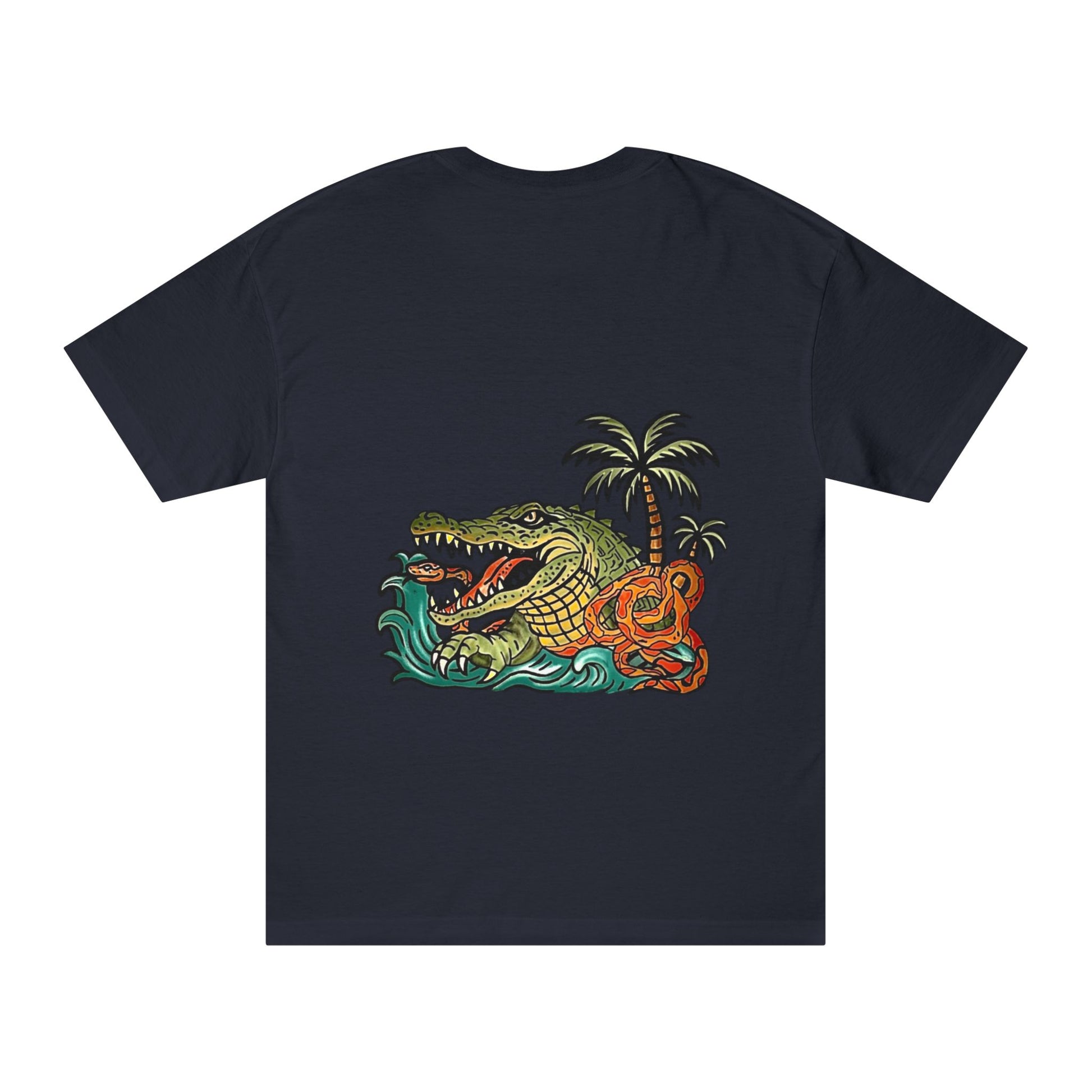 This classic tee carries a bold, retro wildlife scene—an alligator rising from tumbling waves with palms and sunset tones—so you can wear a bit of swamp spirit wherever you go. The relaxed, classic fit and midweight cotton feel like a reliable go-to for weekend hangs, beach runs, or casual rallies for conservation. Subtle chest artwork and a larger back graphic balance low-key and statement looks; it layers easily under a jacket or stands alone with jeans. It’s designed for comfort that lasts: reinforced seams, a ribbed collar that keeps its shape, and a tear-away label for itch-free wear. Whether you’re drawn to outdoor adventure, coastal living, or environmental causes, this tee puts personality front and center without trying too hard.